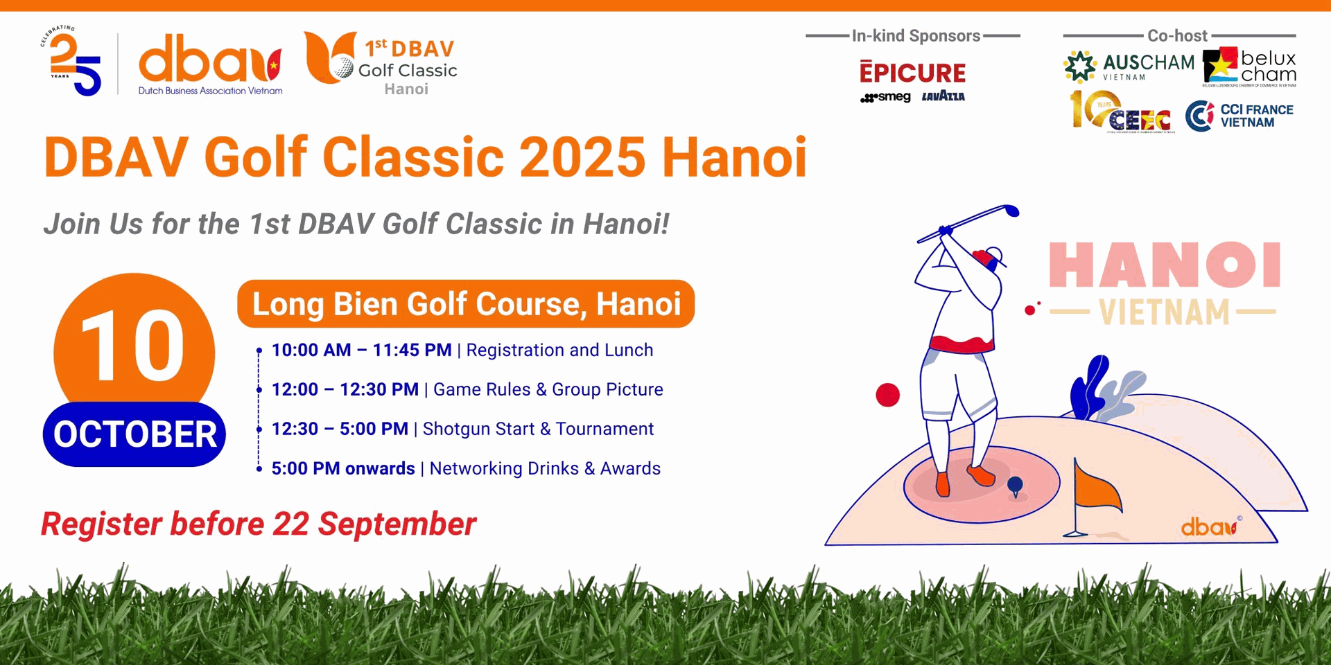 Hosted by the Dutch Business Association Vietnam DBAV π³π± and supported by BeLuxCham Vietnam, whether youβre a seasoned golfer or an occasional player, this tournament promises a day of sport, fun, and connections. The event will wrap up with networking drinks, a perfect chance to share stories from the course and build new business relationships.