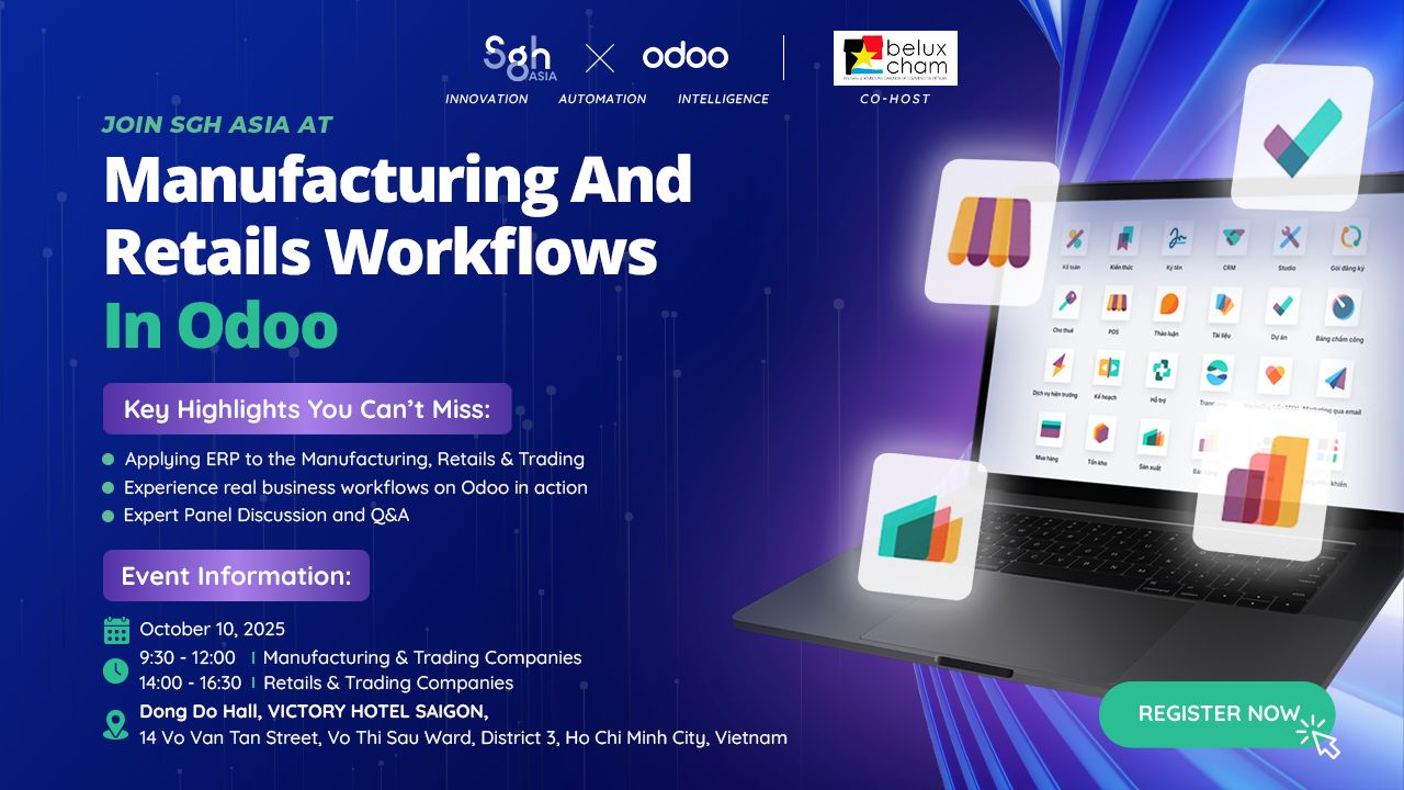 Understanding these common challenges in the digital transformation journey, SGH Asia, with over 15 years of experience in ERP & CRM consulting and implementation in Vietnam, is partnering with Odoo (a global leader in ERP & CRM solutions) to bring insights and practical guidance to help manufacturing, trading, and retail businesses overcome obstacles and accelerate growth with ERP.