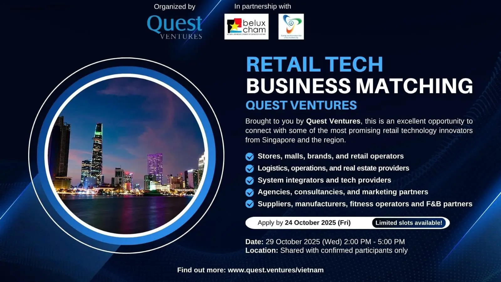 📩Quest Ventures, in partnership with BeLuxCham Vietnam & Saigon Innovation Hub, is pleased to extend an exclusive invitation to select partners for the Retail Tech Business Matching Event.